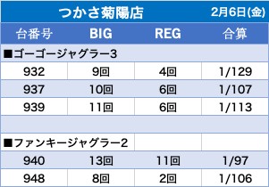 「北斗転生2」や「攻殻機動隊」など、今年の新台勢が万枚突破の大活躍。さらには「炎炎2」や「ゴブスレ2」などの直近の新台にもしっかり好調台あり。いつもよりもジャグラーが元気がなかった分、しっかりとスマスロ勢が活躍していました。