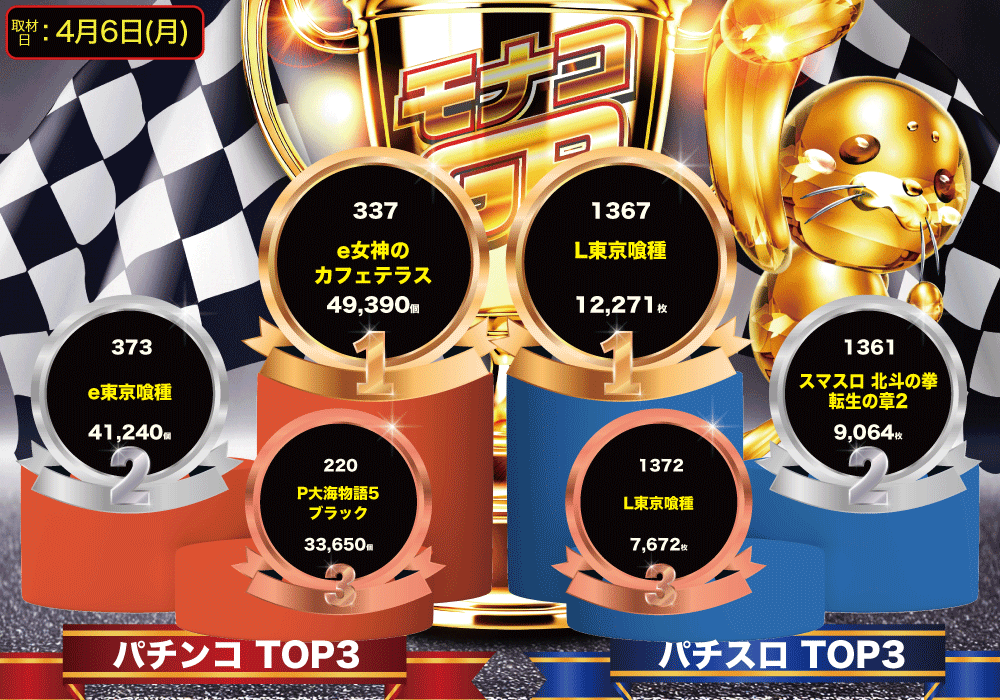また、パチンコでも「東京喰種」が3台ランクインする結果となり、パチ・スロともに同機種へ注目が集まる内容となっていました。